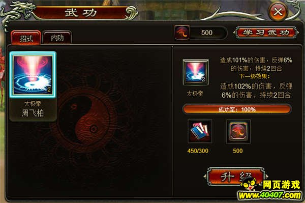 在武功升级界面可花费技能升级书和真气对招式和内功进行升级,武功级别越高,招式的威力越大,内功的加成属性越多。