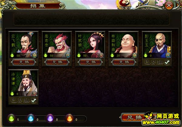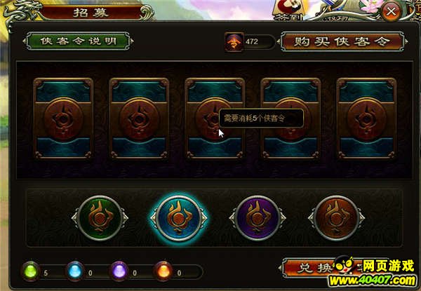 在招募界面中用侠客魂兑换各种侠客。不同品级的侠客所需侠客魂的颜色和数量也不同。