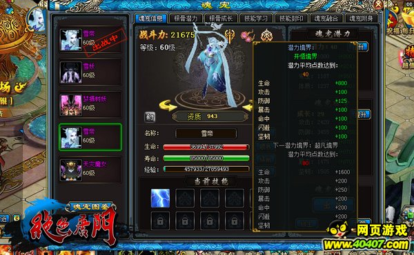 新生的魂宠潜力境界处于未激活的状态,品质显示为优秀。潜力提升以40为一个阶段,当四种属性都达到40时,魂宠境界就能达到开悟境界,同时品质变成精品;当所有属性达到80时,境界提升至超凡境界,品质变成极品;以此类推,当潜力属性达到120时,境界升至登峰造极,品质也将变为人人羡艳的神裔!