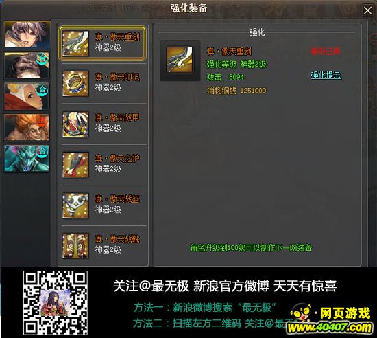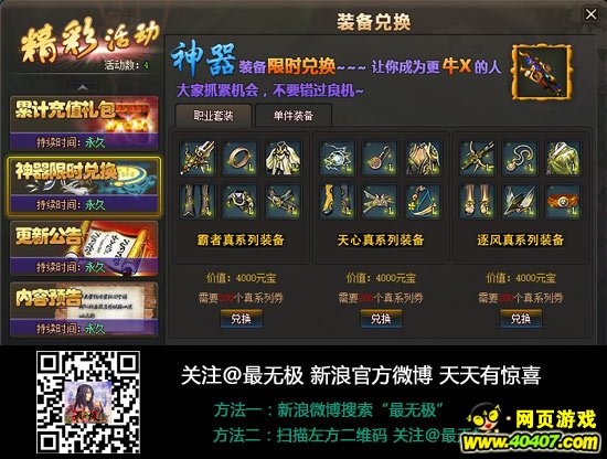 武器就相当于我们的第二生命,新浪玩玩《最无极》的武器为不抛弃式,玩家通过不断升级武器,从而提升战斗力。因此,想要利用武器增强玩家实力,那就要从根本上寻求突破。玩家在“精彩活动”中可购买到真系列武器、装备,其属性优于普通武器,尤其是在游戏后期,将更为明显,可大幅拉开玩家之间的距离。