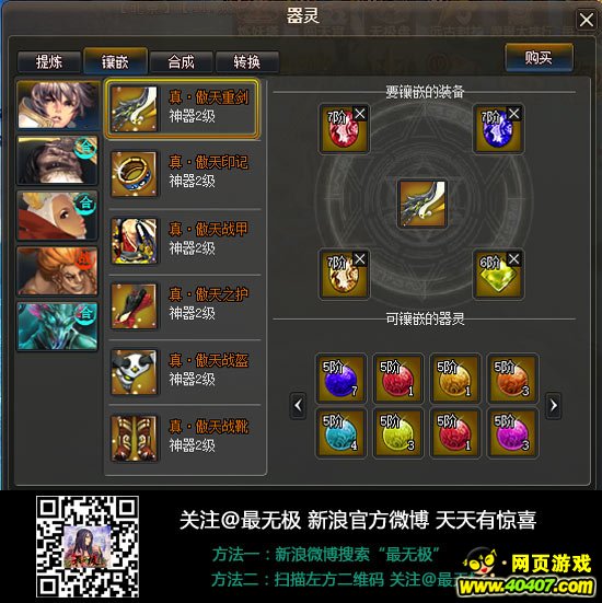 当玩家的武器升级到一定等级后,器灵玩法激活。玩家可在武器上镶嵌宝石,从而赋予武器不同的属性。武器的开孔,无需玩家额外购买打孔符等特殊道具。只要玩家装备的武器等级达到指定等级后,自动开放!武器的强化等级越高,可开启的器灵镶嵌孔位越多。玩家通过任务、游戏活动、闯天宫等处,可获得器灵碎片。通过器灵碎片地不断合成,将能获得高级宝石。宝石等级越高,附加的属性就越高!