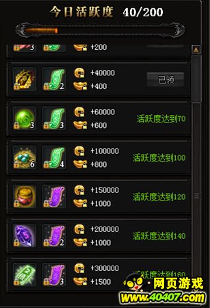 【活跃度】玩家在七杀中参加日常活动,能够获得活跃度。打开右上的“活”图标能够看到哪些活动能够获得多少活跃度,也可以领取相应的活跃度奖励。一般做完一些除魔卫道、石原隘口等经验副本就能轻松获得30活跃度,领取个肉脯喂行会神兽,然后大家就不关注了。其实活跃度奖励是相当丰富的,包括5级黑水晶、状元红、经验符等等,还有将近400W的绑定金币和5500绑定元宝,又是一大笔收入哈!