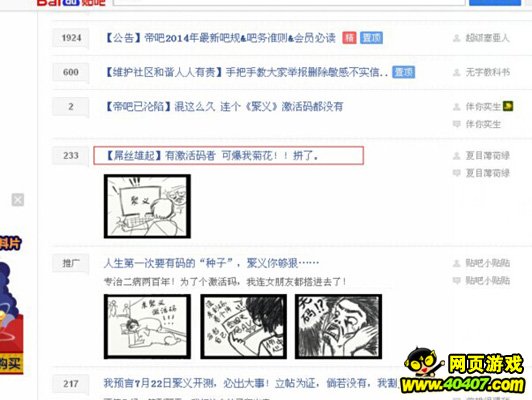 此消息一出,守候“血性三国”多时的屌丝们彻底坐不住了,纷纷爆发怒吼展开抢码圣战。而此时,一则消息亮瞎了小编的双眼,有玩家居然怒爆帝吧,强占屌丝头条,更刷屏求码,曝出恶搞漫画。这真是“no zuo no die why you try”,难道,你就不怕触怒帝吧,引来众人爆菊么?