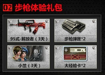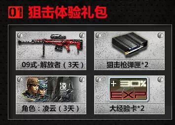 解放者礼包分为“狙击体验礼包”与“步枪体验礼包”。内含有09式-解放者狙击枪、95式-解放者突击步枪、解放者兄妹角色凌云与小兰、步枪狙击弹匣、经验卡。用最低的价格购买之后便能获得武器与角色3天的使用权,可谓是超级的实惠选择。