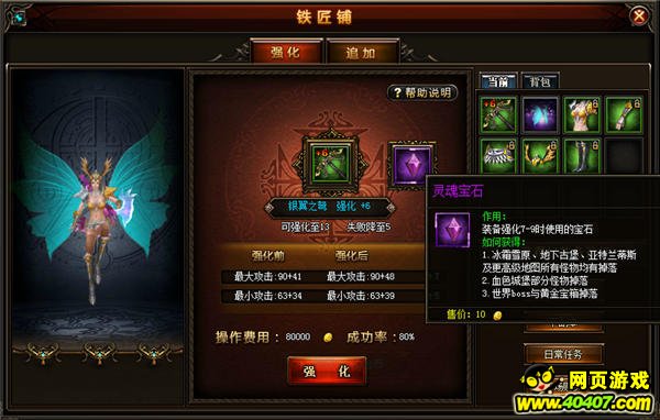当装备强化等级大于6时,强化需要消耗灵魂宝石,同时每往上升一级强化成功率也会相应的降低,强化失败后装备的强化等级也会清零。虽然强化等级越高战斗力提升也越高,但是越往上提升失败的几率也越大。