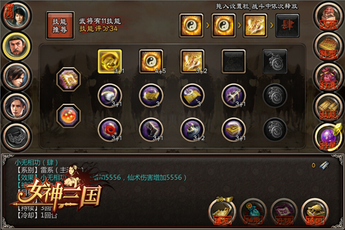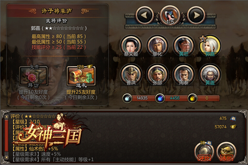 曹操与刘备青梅煮酒论英雄是一段佳话,而游戏中的武将评价系统也可以让玩家论一番“英雄”,指点江山。当帐下某个武将的最低属性、最高属性以及技能评分达到一定条件之后,可进行评价。武将评价一共有十个星级,每评价一次都会获得一个星级,能够大幅度提高武将们的武技伤害、仙术伤害、防御、速度等等,并且还能增加技能等级。当达到7星以上时,更可以让武将多出两个可穿戴的装备数量,威力大增!