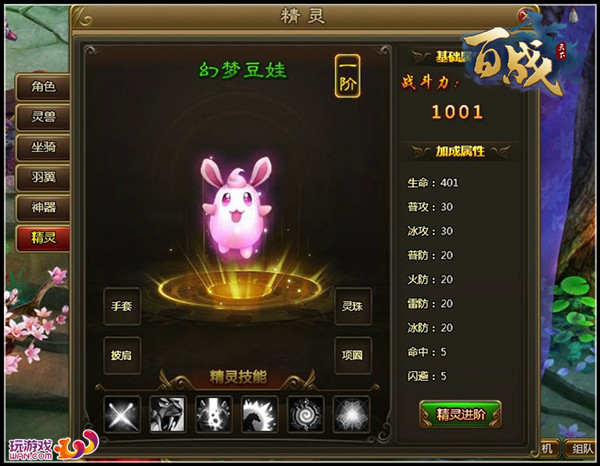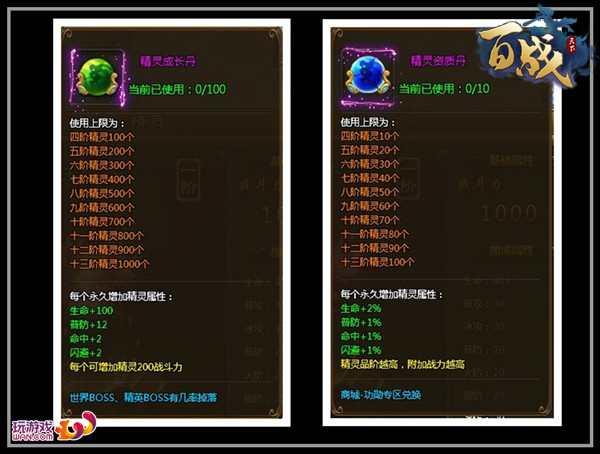畅游wan《百战天下》里的精灵在人物等级到达30级时可通过主线任务获得,首先开启的是一阶精灵幻梦豆娃。精灵在【人物—精灵】界面中显示,与主人同等级,等级越高,战斗力越高。精灵一共分为十阶,每次一进阶成功都可以有更高的战斗力并且获得更酷炫的新造型。精灵品阶达到二阶还能获得精灵技能,四阶开放精灵成长和精灵资质,提升战斗力。
