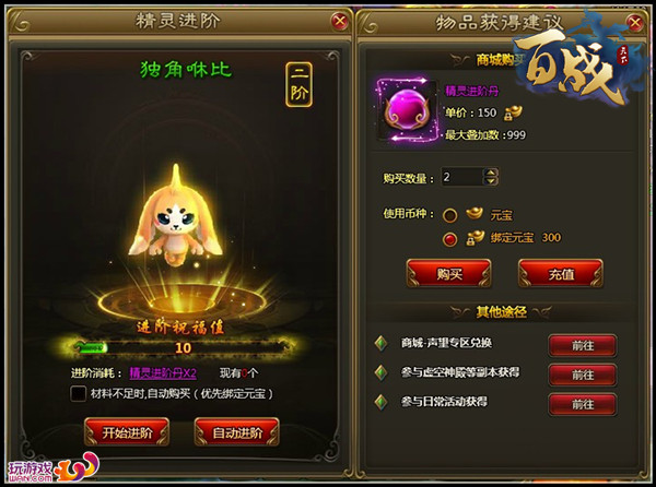 精灵通过消耗[精灵进阶丹]进阶,精灵进阶丹可以在进行主线任务的时候获取,也可以通过商城购买,可以用绑定元宝和元宝进行购买。每次消耗进阶丹都可以增加祝福值,祝福值越高,进阶成功性越大。当祝福值满的时候,下次进阶必定成功,进阶成功后,祝福值将会清空。需要注意的是:品阶达到三阶时,进阶祝福值在首次进阶后开始倒计时,24小时会内将会被清空,建议玩家准备足够的精灵进阶丹一次性完成进阶。