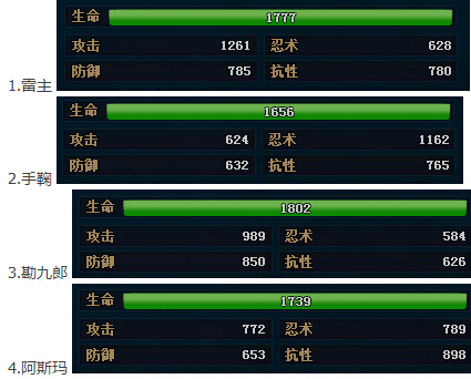 第二部分,测试攻击方为小号 首先是沙包面板,同时也是上面的初始测试时的面板 以下分别是4个小号的面板 ![]() 下图为双方1层毒效果 ![]() 测试结果:沙包生命6487 抗性3244,受到勘九郎攻击中毒,单层毒伤害259,为最大生命值的3.99% 雷主生命1777 抗性780,单层毒伤害159,为最大生命值的8.95% 手鞠生命1656 抗性765,单层毒伤害149,为最大生命值的9.00% 勘九郎生命1802 抗性626,单层毒伤害162,为最大生命值的8.99% 阿斯玛生命1739 抗性898,单层毒伤害156,为最大生命值的8.97% ━━━━━━━━━━━━━━━━━━━━━━━━━━━━━━━━━━━━━━ 最后来个总结吧: 中毒所造成的最大伤害为目标生命值的4%-9% 浮动值与攻方忍术&目标抗性差值相关 本次测试中,差值范围在946-1098之间 大神可以根据此推算出算法