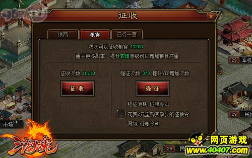 首先,官府征收所获得的粮食占了最大的比重,所以玩家在征收之前需将农场建筑里的农田与水车的等级升到最高,其中农田等级决定粮食产量,水车等级可按百分比增加农田产出。在96PK《三国魂》中,官府征收每天仅限10次,玩家使用道具“加赋令”的效果等同于额外征收一次,此外还可使用道具“征粮令”进行强征。