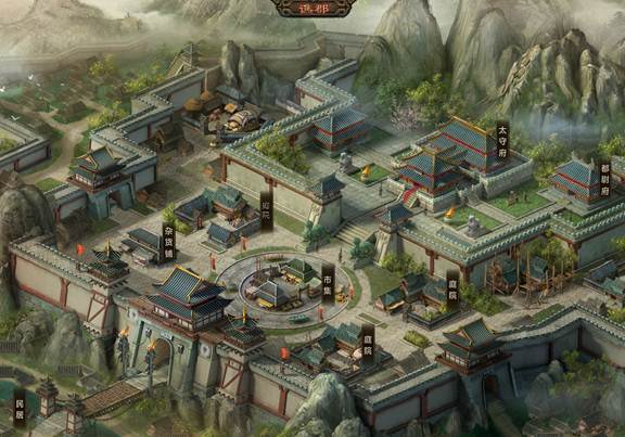 都城:酒馆、市集、珍宝阁、军械铺、杂货铺、黑市、庄园、别墅、豪宅、庭院