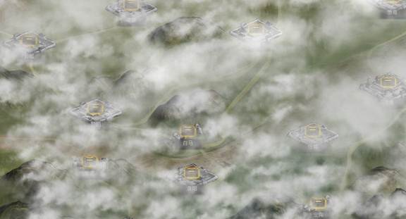 世界地图上,未开启的城池被迷雾遮盖,需要玩家主动探索来开启。