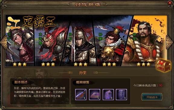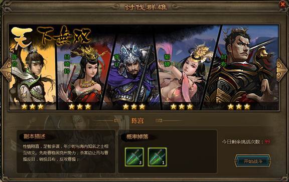《大皇帝》丰富的征战玩法,为玩家提供了各种挑战模式,在这些模式中,玩家需要针对性的选择武将和安排出阵,能不能搞定这些高难度的目标,就看你的了。今天给大家介绍的就是《大皇帝》征战玩法之:讨伐群雄