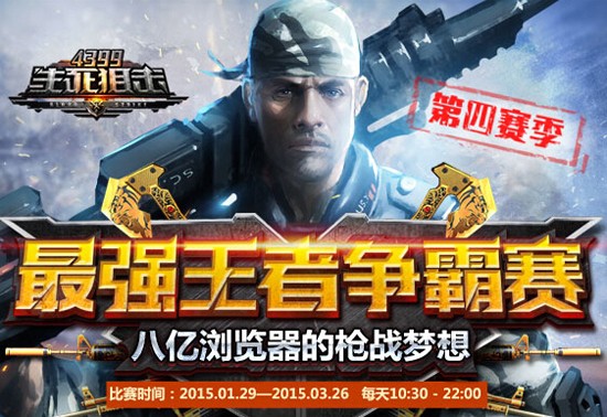 《4399生死狙击》最强王者争霸第三赛季才刚刚落下帷幕,第四赛季就早已马不停蹄地开战,打响春节前奏!2015年1月29日至3月26日,第四赛季常规赛邀你一起为王者荣誉而战!