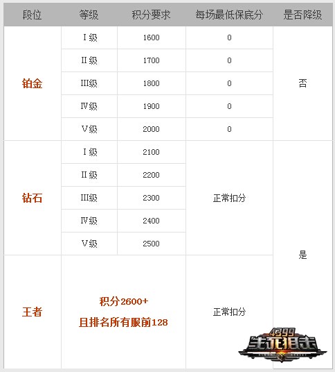 4、钻石以下每个段位,均有最低保护分,有0-10分不等;钻石以上(包括钻石)段位,没有最低保护分,按上一场实际情况进行积分的增加或扣除。