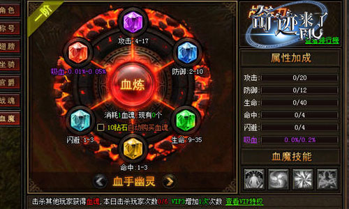 9377《MU奇迹来了》新版本隆重推出血魂系统。当你修炼至180级的时候,便可无上荣耀地推开血魂系统的大门,使用血魂功能。在往后的日子里,你每天击杀其他玩家,便可获得血魂。不过,当天击杀同一名玩家只能获得一次血魂,而且,若双方等级差超过50级,将不获得血魂。每天击杀其他玩家获得血魂是有次数限制的,当然,如果你是VIP,则可增加击杀玩家获得血魂次数哦!