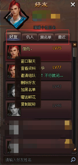 好友分类:好友、仇人、黑名单。右键点击好友人物头像出现详细资料,可选择私聊,邀请组队等。