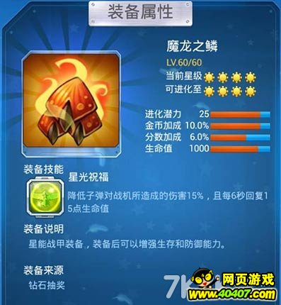 星光祝福:降低子弹对战机所造成的伤害15%,且每6秒回复15点生命值。