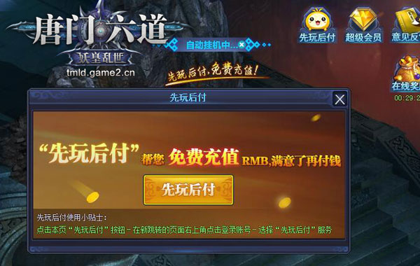 哥们网《唐门六道》首创“先玩后付”新模式,首次使用的玩家可以使用该系统获得10元的消费额度,免费完成游戏充值。使用“先玩后付”,玩家可以轻松享有首冲奖励,升级更加神速!该模式下,玩家拥有7天的还款时限,只要在7日内进行还款即可。