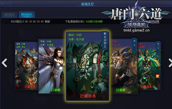哥们网《唐门六道》每日13:00、16:00和20:00都会在不同的地图刷新出野外BOSS。玩家可以在“活动大厅”处得到野外BOSS的最新状态。