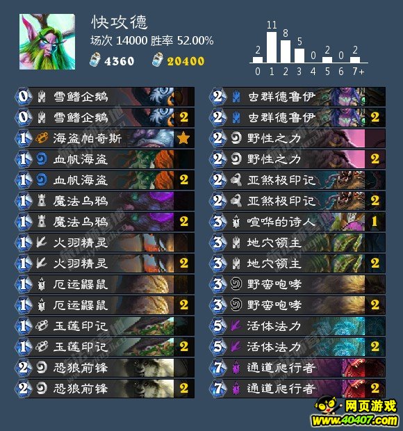 大家好,这里是MS周报第51期。版本开了一周,圣骑士凭借战斗号角一张紫卡拿下了版本霸主的位置。目前看来新卡的开发空间剩余不多了。留给萨满的时间不多了。 这篇周报和其他国外周报不同,所有分析完全由国人所作,不存在翻译和转载,独立原创,禁止一切形式转载。 数据来源:炉石MS、HS狗头人与地下世界第2周,MS周报全称是Hearthstone Meta Stats,和VS周报类似的,使用了HDT和Track-O-bot两种软件采集玩家的数据,因为HDT在个人推广下在国内还有一定基数,所以该插件也有不少国服的数据,目前4服数据大概中欧美各占三分之一,亚服用的少只有1%。如果你想帮助完善数据或者尝试一下HDT的效果,你可以点击我的头像利用我的签名档上的短链接(复制到剪贴栏)下载HDT开启插件。这个插件名叫卡组分析器,不仅可以采集玩家大数据,也可以帮助分析对手的卡组构成,目前已更新狗头人与地下世界版本。 ![]() ![]() ![]() 控制术以及最近崛起的中速龙牧热度横扫天梯5-传说。 可以说牧、术、骑、法、贼包揽了顶端天梯的所有热度。 胜率排行榜 5-传说 ![]() 版本初+月中所以采用5-传说作为参考标准。 防止试卡组的和娱乐套路的。 T1卡组 快攻骑、鱼人骑 T2卡组 宇宙牧、节奏贼、快攻猎、龙牧、海盗战、大大牧、快攻德、动物园、奥秘法、恶魔术、青玉德、奇迹牧 T3卡组 招募猎、大大德、铺场萨 T4卡组 猎魔人、奇迹德、奇迹贼、恩佐斯骑、四舍五入法、招募德、任务法、爆牌贼 其实本周和上周差别不大,主要因为牧师和术士牢牢把控着天梯的速度,除了极快的骑士其他中速卡组基本和控制卡组打成一团,甚至靠恶毒召唤师抢死控制卡组。 本周我们来聊聊上周没聊的T2卡组。 ![]() AAECAaIHBrICrwSRvALKwwLP4QKc4gIMtAHtAqgF1AXdCJK2AoHCAuvCAsrLAqbOAvvTAtvjAgA= 一个主要问题还是因为通道爬行者的加入,中速、快速曲线都直线拉高,打控制反而更加难了。尤其是以法术为主的控制职业,前期没有随从交换反而崩盘,如果对手带了爬行者,交了AOE一波反而可以先返场。 目前节奏贼只加入了精灵咏唱者过牌和索尼娅补牌以及通道爬行者,并没有太多新意。而且随着控制卡组增多,范克里夫效果更加一般了。 ![]() AAECAR8CrwSRvAIOqAK1A6gF1AXZB+sH/gzquwKvwgLkwgKOwwL70wLh4wKL5QIA 可以说这版本设计师最大的功劳之一是把狮子请出了猎人的构筑。一直以来偏中速的猎人都会带上狮子导致橙卡屡屡被埋没,设计出来就会和狮子比较。而目前版本猎人虽然昙花一现出现过T1,但是雁过留痕,至少不是版本隐藏角色了。 ![]() AAECAa0GAo0I0OcCDgjyDIK1Arq7AvC7AtnBAsrDApnIAsrLAs7MAqbOAvvTAsvmAtfrAgA= 这套对10牧我还特地测试过,经常上手对10然后被对面打崩。。。 只能说恶毒召唤师和档案管理员这些上下限差距特别大的卡已经引导中速卡组走向投硬币的道路了。 不卡手,随机出的好就赢。卡手,随机出的差就输。 可以说这是目前按费拍怪的极致,你还不能上手法术。 ![]() AAECAQcE/wORvAKc4gLP5QINHLACkQOOBagF1AXuBoKwAoiwArm/AuvCAs/jAtfrAgA= 特别把带新卡的海盗战拿出来说。带上恶毒召唤师胜率感人,不是所有牛奶都是特仑苏,也不是所有卡组都适合带恶毒召唤师,尤其7费生物杂毛多了去。宁可去掉通道爬行者去赌心态,所以胜率感人。远不如传统的海盗战好用。 ![]() AAECAa0GBqIJqKsChbgCt7sCws4CkNMCDNMK1wqhrALovwLqvwLRwQLlzALmzAK0zgLwzwLo0ALj6QIA 事实上心灵尖啸很适合大大牧,因为生物基本是嘲讽大屁股,要么被解要么没拉出来,而龙息药水打很多职业并不能解决问题,比如5/5以上的青玉,术士大把恶魔还有中速龙牧。 但是目前来说大大牧打起来只看发牌员,并没有太多技巧可言。 ![]() AAECAZICApG8AoPUAg73A+YF2QflB8GrArazAs27AobBAuvCAuLKApvNApHQAvvTAovlAgA= 其实如果不是战斗号角,德鲁伊的快攻之王地位仍然难以被撼动。尤其新版本113的加入充实了快攻德的1费曲线,使得现在铺场速度更加迅速。新加入的332诗人是我在预览时候觉得可能加入的一张新卡,这套牌也加入了进去,可能更方便杂毛交换和脱离AOE射程。 ![]() AAECAf0GApG8ApfTAg4w9wSoBc4Hwgj2CLy2Ase7Asm7AvfNAqbOAvHQAvLQAvvTAgA= 动物园失去力代后目前偏中速话发展。有了优质2费恶魔随从加入后也抛弃了2王子。其实作为术士的BUFF牌来说,恶魔之火、血怒药水都远远比不上圣骑士的神圣光芒和王者祝福,但是术士随从以血换身材,超模效果配合BUFF能做到顺风滚雪球的作用。目前还是比较偏中速,理由也是没有力代没法抢死人,只能慢慢靠骨魇等打节奏。 ![]() AAECAf0EAr8IotMCDnHAAbsClQOrBOYElgXsBde2Auu6Aoe9AsHBApjEAo/TAgA= 这可能是最便宜的快攻了,因为没有帕奇斯、火车王等橙卡随从,也没有通道爬行者等中速紫卡。 一个字快,用速度换质量。尤其是目前控制卡组回血并不多,嘲讽特别多,奥秘法法术过墙的优越性就体现出来了。 ![]() AAECAf0GBu0F2wbMCMnCApfTAtvpAgz3BLYHxAjexALnywLy0AL40AKI0gKL4QL85QLq5gLo5wIA 目前最强的卡组之一,5-传说胜率55%,可以说T1卡组的强度。不过被其他恶魔术卡组整体拉下了胜率,所以恶魔术位列T2末尾。但是单轮卡组胜率,魔块术名列前茅。 卡组基本是2个核心,一个是苟活,从1费药剂师、黑暗契约、2费甲虫到法术石,DK,939大哥嘲讽,这套卡组一点都不贪。另外一个就是OTK斩杀,准确说可以分回合召唤出大哥和魔块,再用契约拉出大哥来。 打各种形态的贼、德、骑都是大优,唯有牧师比较难受。 如果有条件可以拿来使用上分。 ![]() AAECAZICBK6rAuC7ApS9ApnTAg1AX8QG5Ai+rgK0
