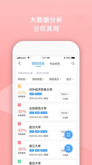 熊猫志愿平台上提供的都是正规的院校能够让用户在这里安心的选择自己心仪的大学,而且不管用户是否有特长,是否有喜好都能够在这里和专业的教育专家进行沟通交流,从而能够针对用户的不同需求和差异进行更加精准的分析和推荐哦!