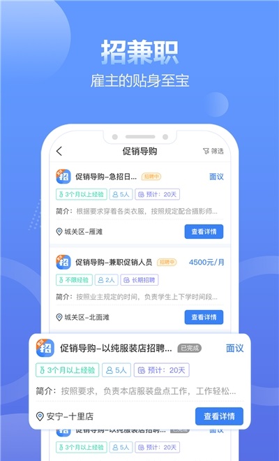 兼职招聘宝是目前非常火爆的一款线上兼职平台,软件有着非常丰富的功能,在这里你可以自由选择线上兼职和线下兼职,有着多种不同的兼职方式可以自由选择,同时覆盖了全国所有城市,你可以更加轻松地寻找到自己心仪的工作。