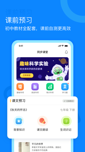 这款学习软件界面清爽,给学习提供了非常丰富的学习体验,在这里你可以学习到更多的语文知识,通过线上学习的方式可以让你更加详细的进行课本预习,专业导师一对一进行辅导,帮你克服一切难题!