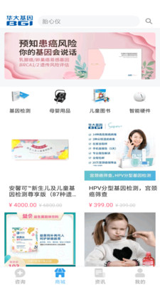 华大基因此款购物平台也会展示出更加专业的基因检测功能,也可以随时随地购买相关的不同丰富产品,更多的育儿知识也可以在软件上面学习,基因的解读和分析需要通过专业的产品进行检测,可靠的,专业的相关的不同服务包括基因科技,基因检测,遗传咨询等。