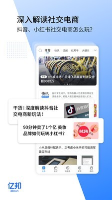 亿邦是一款内容非常丰富的电商服务应用平台,在这款软件中包含了关于电商方面的相关知识内容,用户通过这款软件可以更加深入的去解读社交电商模式,让你可以更加清晰的去了解抖音或者是小红书社交平台的电商怎么玩,丰富的电商知识内容,能够为用户提供更多的便利。