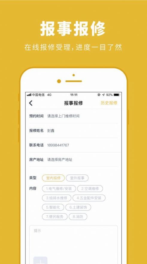 1.当我们家里有任何问题,出现任何故障时,还可以一键报修,维修人员会快速的上门。