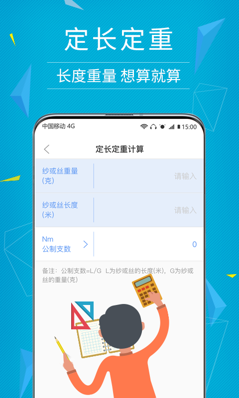 纺织工具箱是生活服务类软件,这个软件能够给用户提供比较专业的纺织计算工具,用户通过利用这个软件能够去完成一些产品的定量定长计算,这样的软件使用也显得十分的便利,可以让用户得到更加良好的使用体验,用户也能够在软件当中完成更多单位的换算。