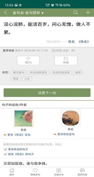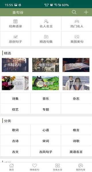 金句谷这是一款生活服务的软件,下载这款软件可以在上面搜索各种不同的名言名句和各种不同的好句子,画面设置非常的简约,各种不同的美文精选推荐都非常的丰富,可以查看各个板块设置的模板造型,非常的清新舒适,在欣赏更多美文佳句的过程中,还可以了解不同的出处和详细的信息。