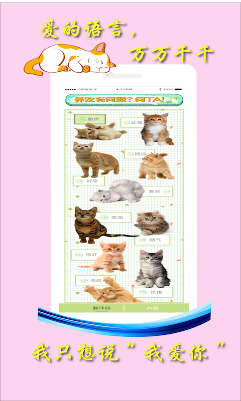 平台上会给各位用户设置许多不同猫科动物的声音,无论动物想要表达的是生气,高兴或是难过,都可以迅速的识别出来,有了这款软件的帮助,有了这款软件,猫咪和主人之间的交流就会更加的融洽,坏脾气的宠物也可以进行无障碍交流,感兴趣的用户可以下载这款软件来和你的猫咪宠物进行一场有趣的交流。