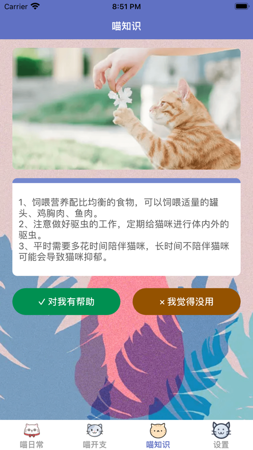 1.每天都会推送大量与猫相关的知识,用户可以根据这些知识来学习一些养猫的小技巧。