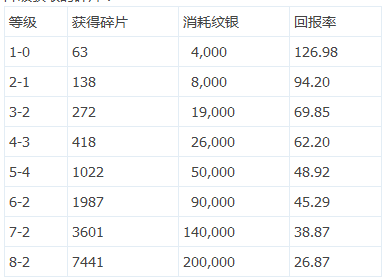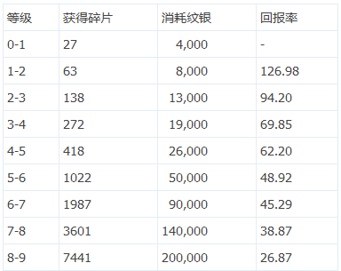 为了方便说明,我把这里点亮低级层说成升级或者降级,回报率指每得到一个元神碎片需要消耗的纹银。